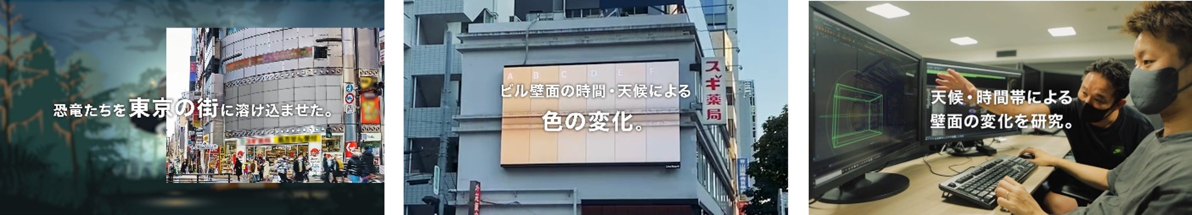 本作品のジュラシック・ワールドのテーマ「人間と恐竜の共存」を街中にも反映するため、舞台を東京に絞り、街に溶け込ませ、突然出現する演出をリアルにするため、天候や時間帯によってクリエイティブを出し分けできるLIVEBOARD社のデジタルOOHを使用しました。日本の都心にある池袋(2箇所)・六本木・青山の4箇所で、場所・時間経過・天候によってガラッと変わる壁面の色の変化を徹底的に研究し、計16パターンのクリエイティブを制作。どの場所、どの時間帯、どの天候においても壁への溶け込みのクオリティが高く、通りがかる人に「まるで恐竜に突然襲われるような」インパクトを与える体験を実現した。ビルの外壁かと思いきや突然出現する恐竜は、映画の中身そのものではないでしょうか。通行人を楽しませると同時に、映画自体の興味関心を促す演出を行いました。