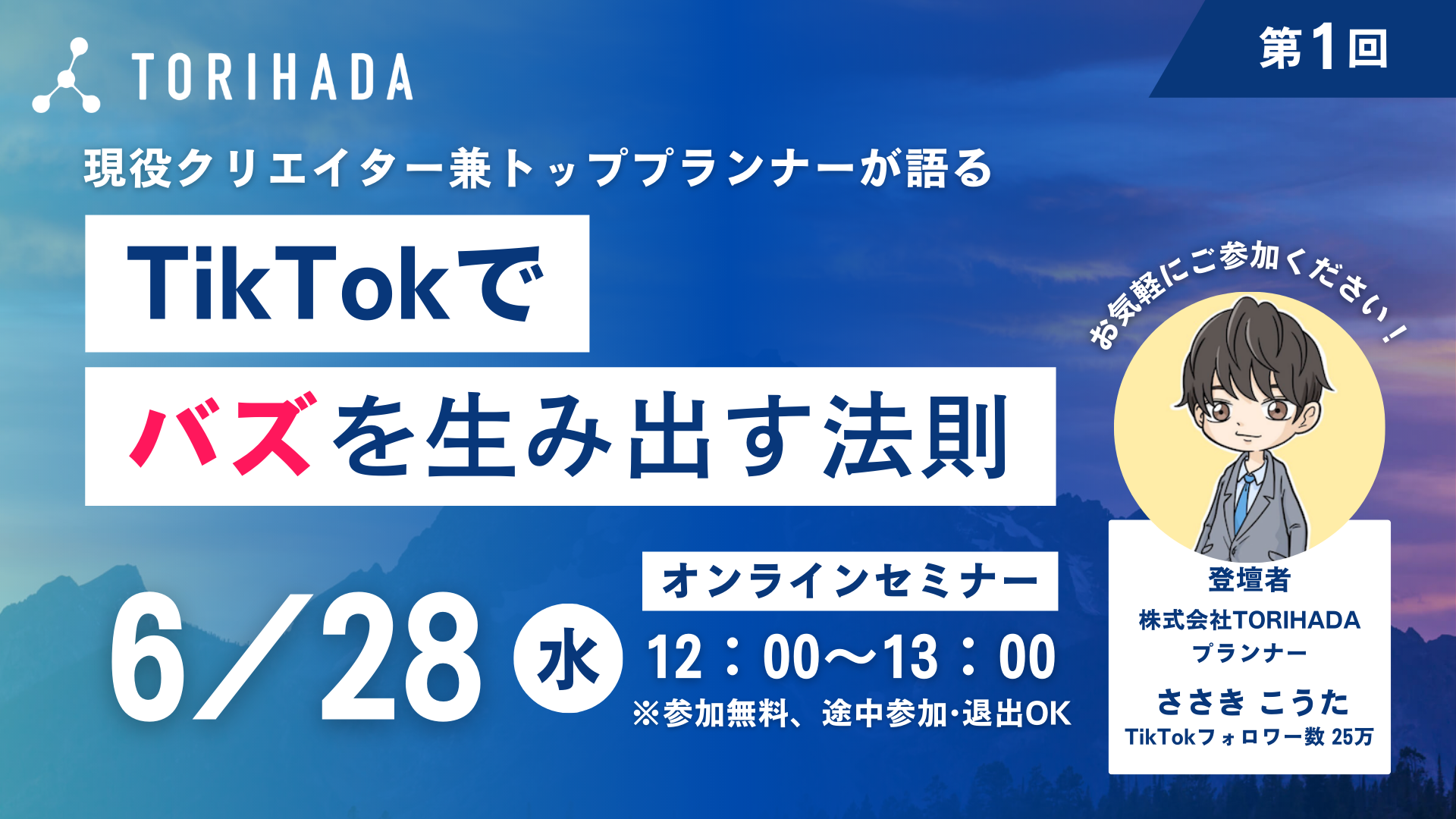 本セミナーでは、TikTokを中心としたショートムービーマーケティング事業を行うTORIHADAが、培ってきたノウハウに基づいたバズを生み出す企画のコツや、直近のトレンド、最新情報に基づくアルゴリズムについての考察、”なんとなくやった感で終わらせない” 振り返りの仕方を解説してまいります。