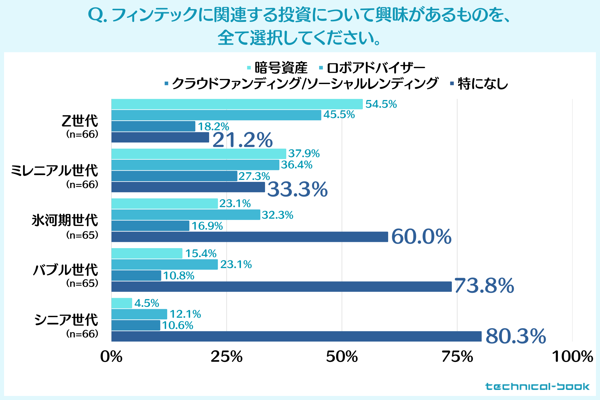 近年新たに生まれている暗号資産やロボアドバイザー、クラウドファンディングといった次世代型の投資について、特に興味があるものはないと回答した割合は、シニア世代では80.3%、バブル世代では73.8%にも上りました。