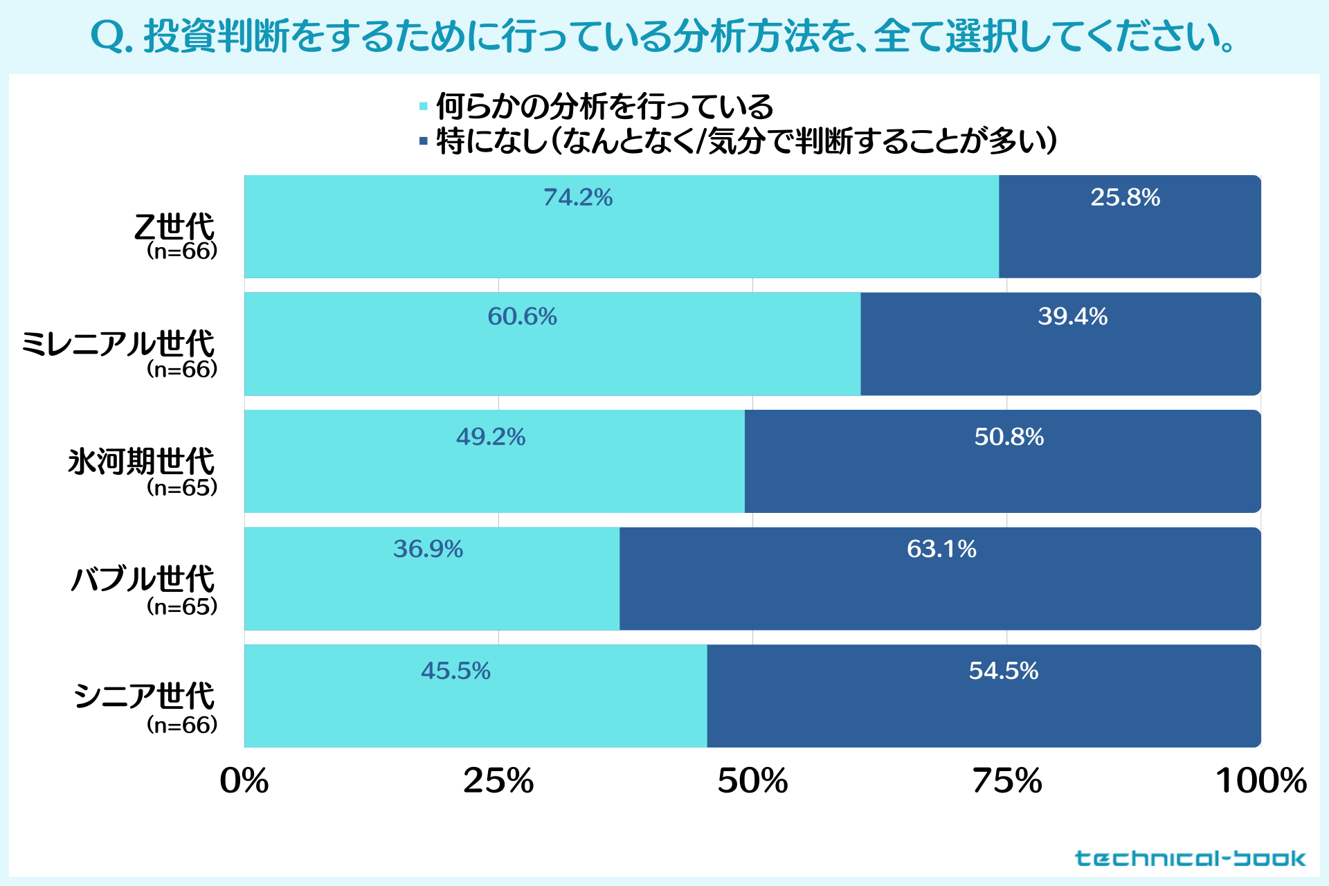 何らかの分析を行ってから投資判断をしている人の割合は、Z世代が最も多い74.2%、続いてミレニアル世代の60.6%となりました。一方、特に分析を行っていないと回答した人の割合は、バブル世代が63.1%と最も多く、続いてシニア世代の54.5%となっています。