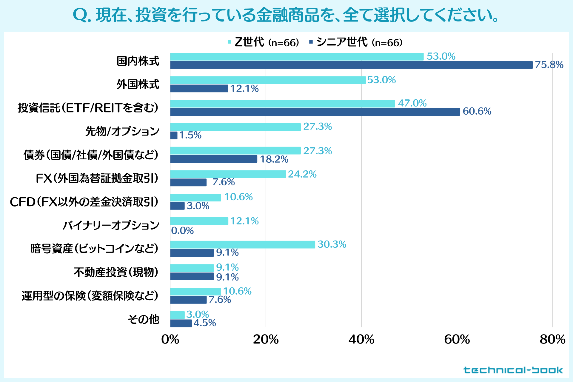 このように、シニア世代の投資先が国内株式と投資信託に偏っているところがあります。これに対してZ世代では、国内株式と投資信託の割合が高いものの人気は分散しており、多様な金融商品に投資している傾向を読み取ることができました。