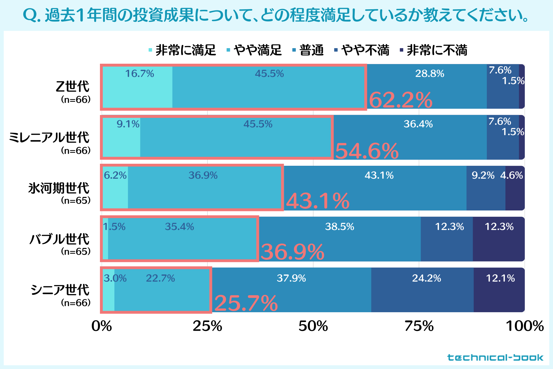 過去1年間の投資成果に対する満足度について、「非常に満足/やや満足」と回答した割合は、Z世代が62.2%、ミレニアル世代が54.6%、氷河期世代が43.1%、バブル世代が36.9%、シニア世代が25.7%でした。逆に「非常に不満/やや不満」と回答した割合は、上の世代の方が高くなっています。