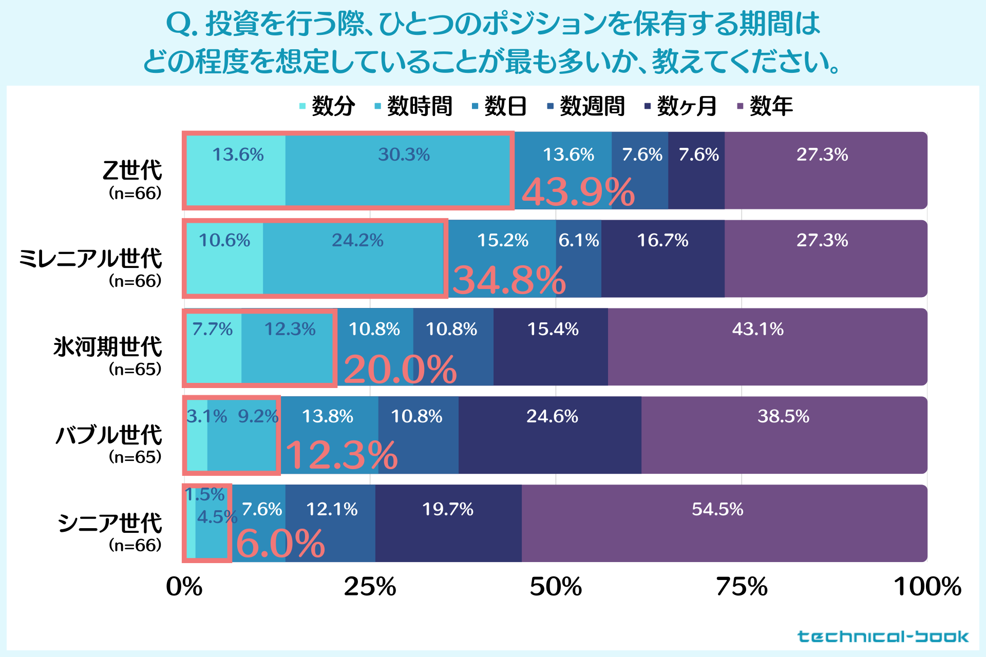 ひとつのポジションの想定保有期間について、「数分/数時間」と回答したZ世代は43.9%、ミレニアル世代は34.8%だったのに対して、氷河期世代は20.0%、バブル世代は12.3%、シニア世代は6.0%でした。