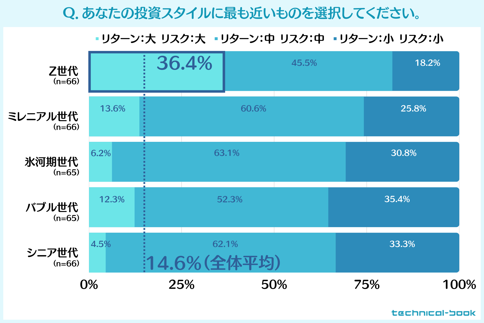 自身の投資スタイルについて、「リターン:大、リスク:大」と回答したZ世代は36.4%と、全体平均の14.6%の倍以上という高い割合でした。