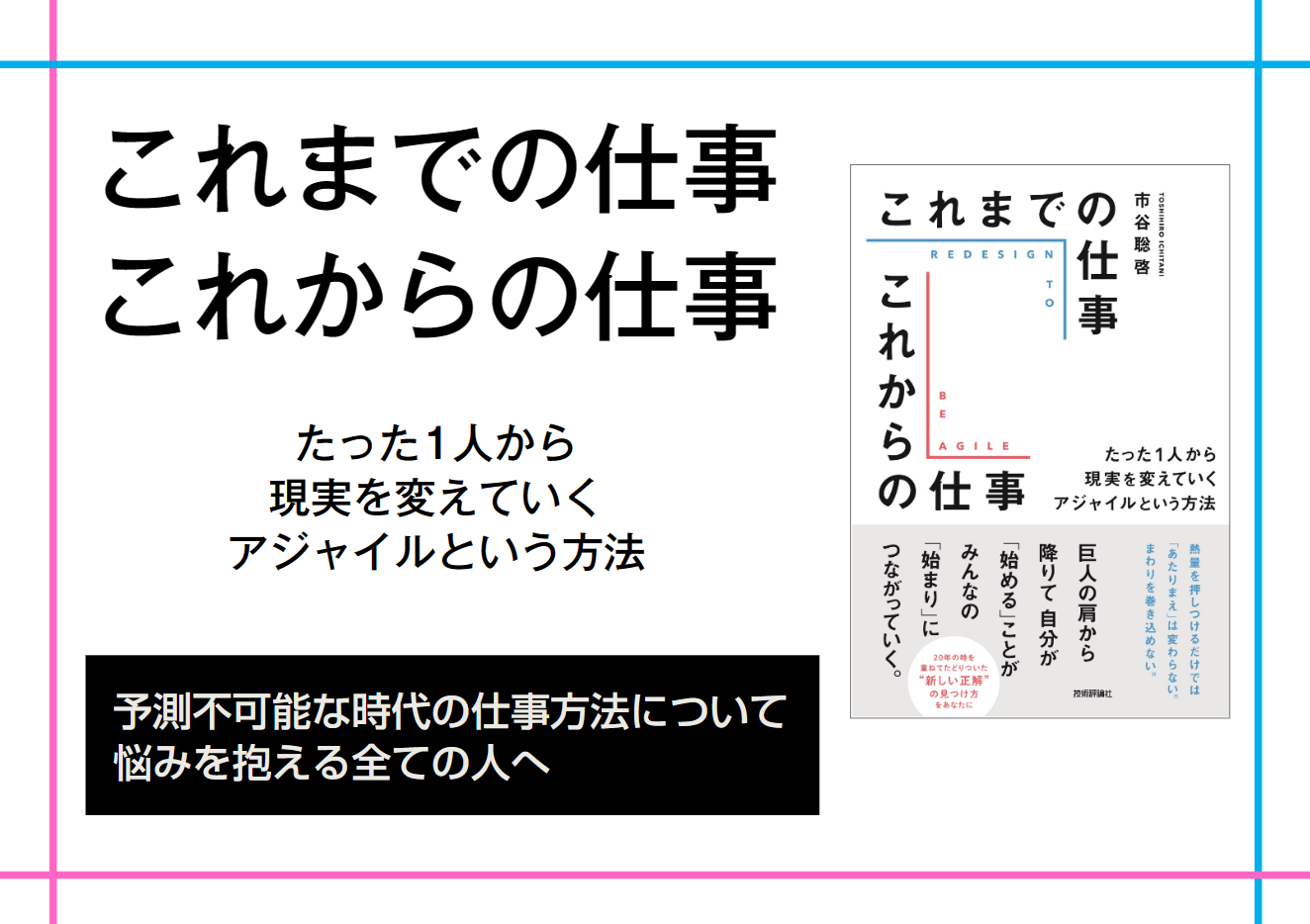 「これまでの仕事 これからの仕事」とは、どこから、どこへの2点間移動のこと。「これまで」がどのくらいあてはまってしまっているか、「これから」への方向感がどのくらい得られているか。この本をそっとあてて、どこからどこへの距離感を測ってみてください。