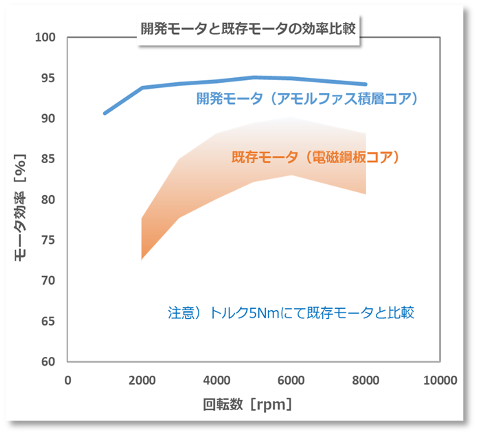 本モータは、大同大学(愛知県名古屋市)加納善明教授との共同研究で、アモルファス積層コアの性能を最大限活かせるモータ設計を実施。その後、株式会社明和製作所(福岡県糸島市)等の協力を得て、巻線・モータ組上げを行いました。既存の大手モータメーカに頼ることなく、中小企業の力を結集することで、1年強という短期間で、5kWクラスとしては世界最高レベルのモータ効率95%(同等出力のモータに比べてモータ効率を5~10%改善)及び1.2kW/kgの出力密度を達成しました。