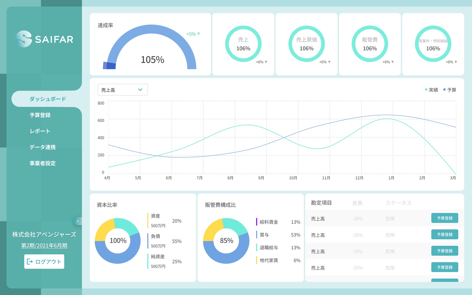 SAIFARは代表取締役CEOである宮國が会計事務所でこれまで中小企業の経営者をサポートしてきた経験から、中小企業による未来を見据えた経営管理の必要性を感じ、その人的リソース不足を解消し、成長支援を行うために立ちあげたサービスです。本サービスではFreee、Money Forward、弥生会計といった会計システムと連携し、経営者が自社の財務状況をリアルタイムで把握し、予算計画とその実績を一元管理することを可能にします。