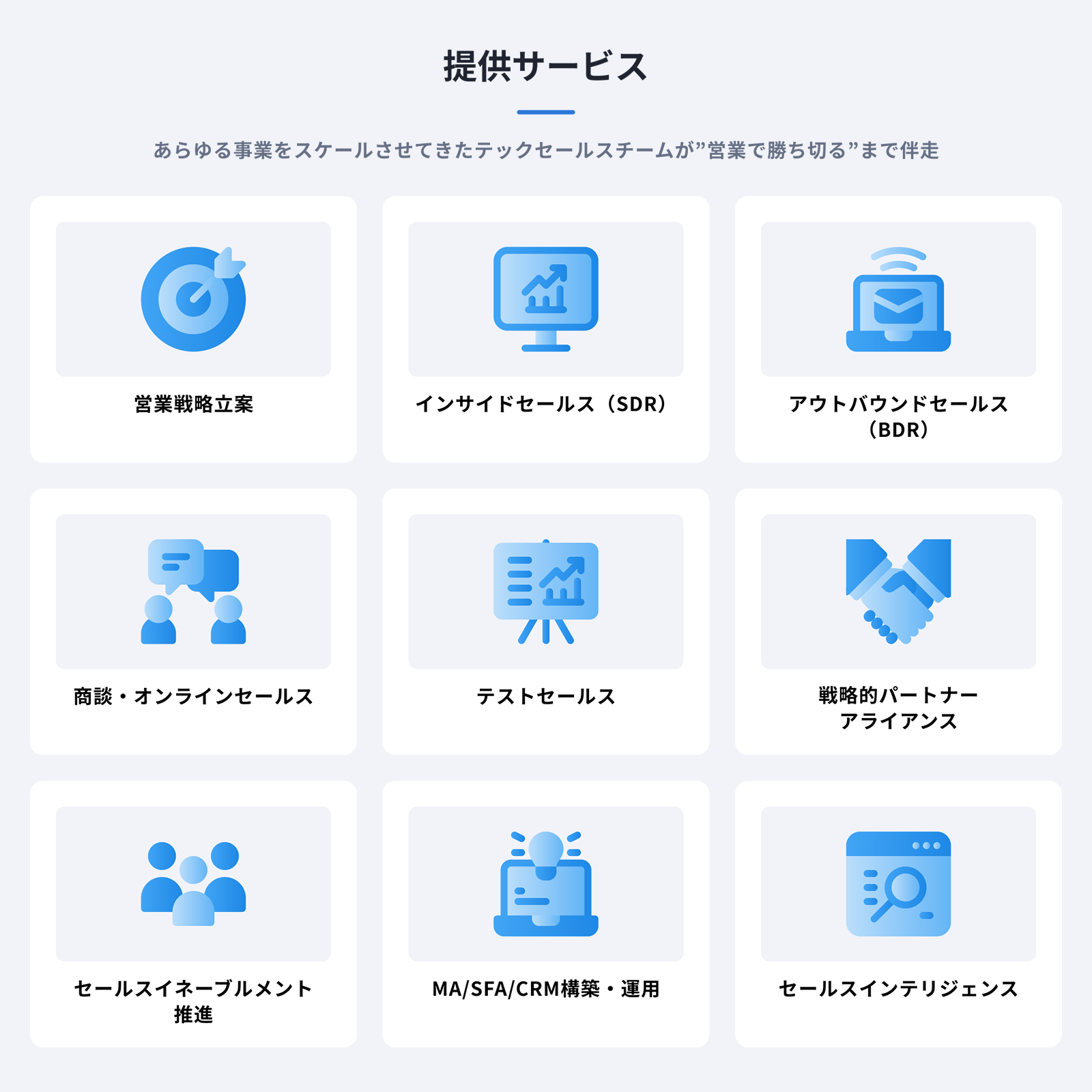 単なる人材派遣や販促支援でなく、顧客課題に合わせて最適なチームを編成し、顧客インサイトの特定から営業戦略立案、セールステックツールを活用した実行・全てのSales Ops領域までを伴走します。