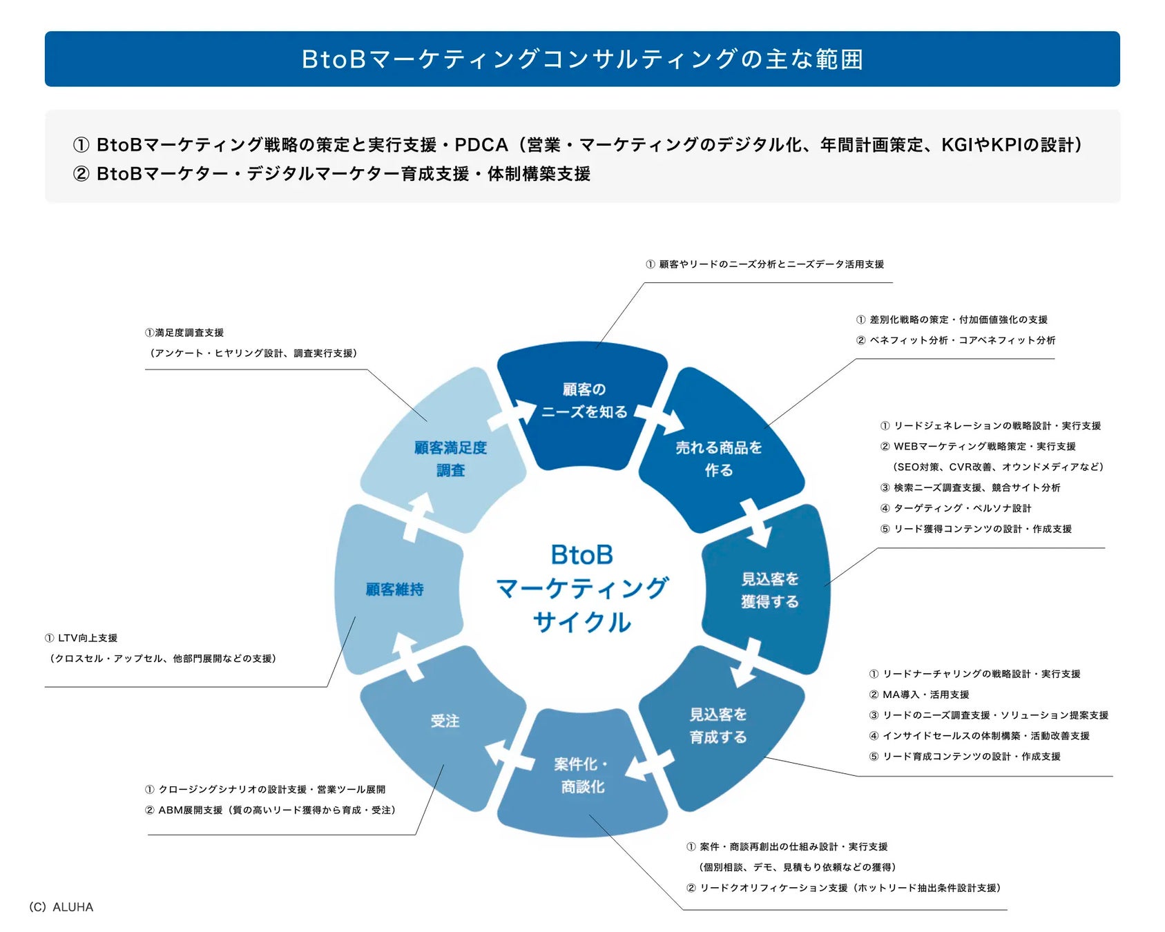 ALUHAは、2008年からBtoB企業に特化して営業・マーケティングのデジタル化の支援を行っている、BtoBマーケティングのコンサルティング会社です。主に下記図のようなBtoBマーケティングサイクルの実現を支援し、BtoBマーケティング戦略の立案から計画策定、実行支援、PDCAまでをサポートしています。