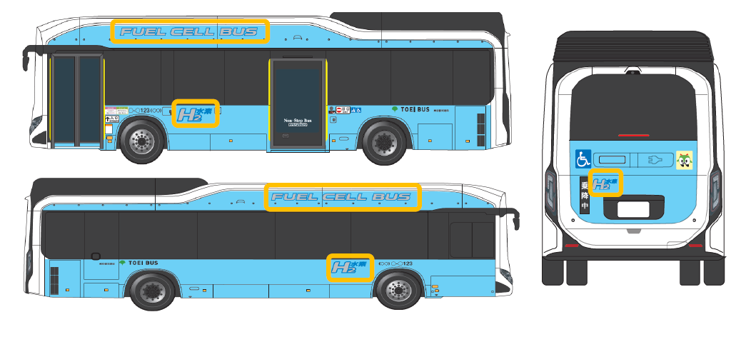 (3) 燃料電池バスと認識できるよう、「H2水素」 「FUEL CELL BUS」 等のステッカーをラッピング広告の上から貼付していただきます。