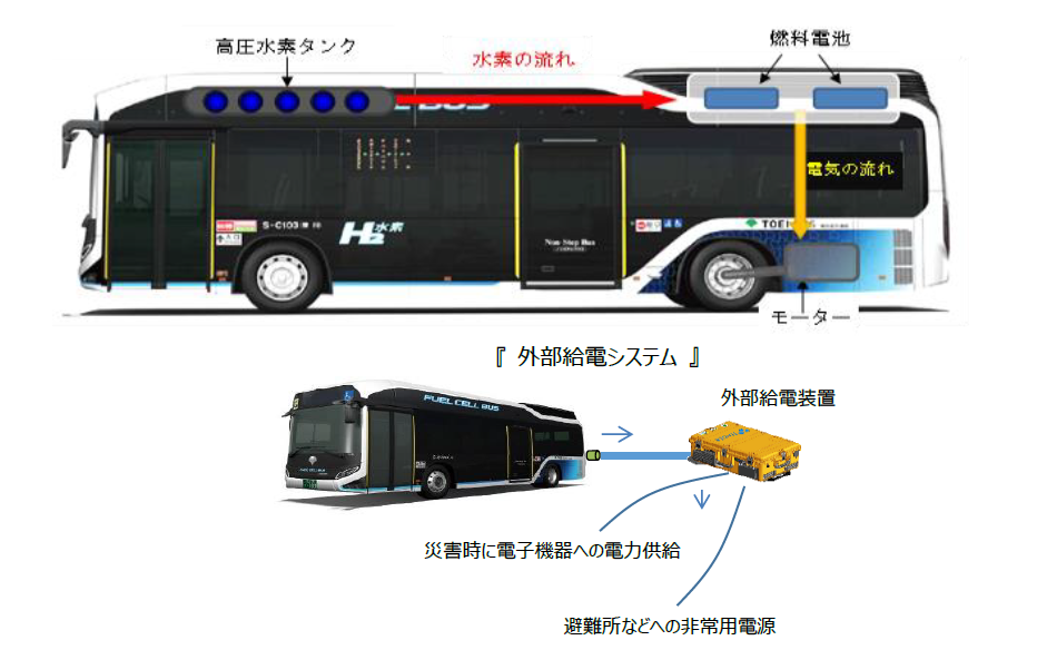 また、燃料電池バスは、災害等による停電時には発電した電気を専用の装置を介することで、非常用電源として活用することもできます。