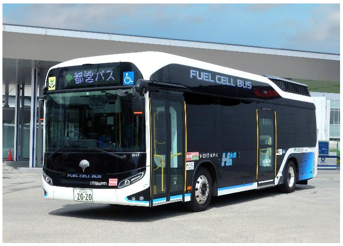 燃料電池バスは、燃料となる水素と酸素を化学反応させて作った電気によりモーター駆動させて走行し、走行時には水しか排出しない、環境に優れたバスです。