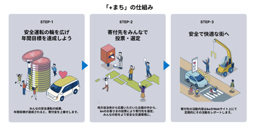 「事故時の安心だけでなく、事故のない世界そのものを、お客さまと共創する。」をミッションに掲げて販売する、イーデザイン損保による保険商品「&e」は、保険商品の中に「+まち(ぷらまち)」(以下「+まち」)とよばれる寄付活動を組み込んでいます。「安全な交通環境・社会の実現」をテーマに地方自治体から企画を募集し、お客さまの投票によって企画を選定、お客さまの安全運転結果に応じて、イーデザイン損保が自治体の企画に寄付を行う活動です。