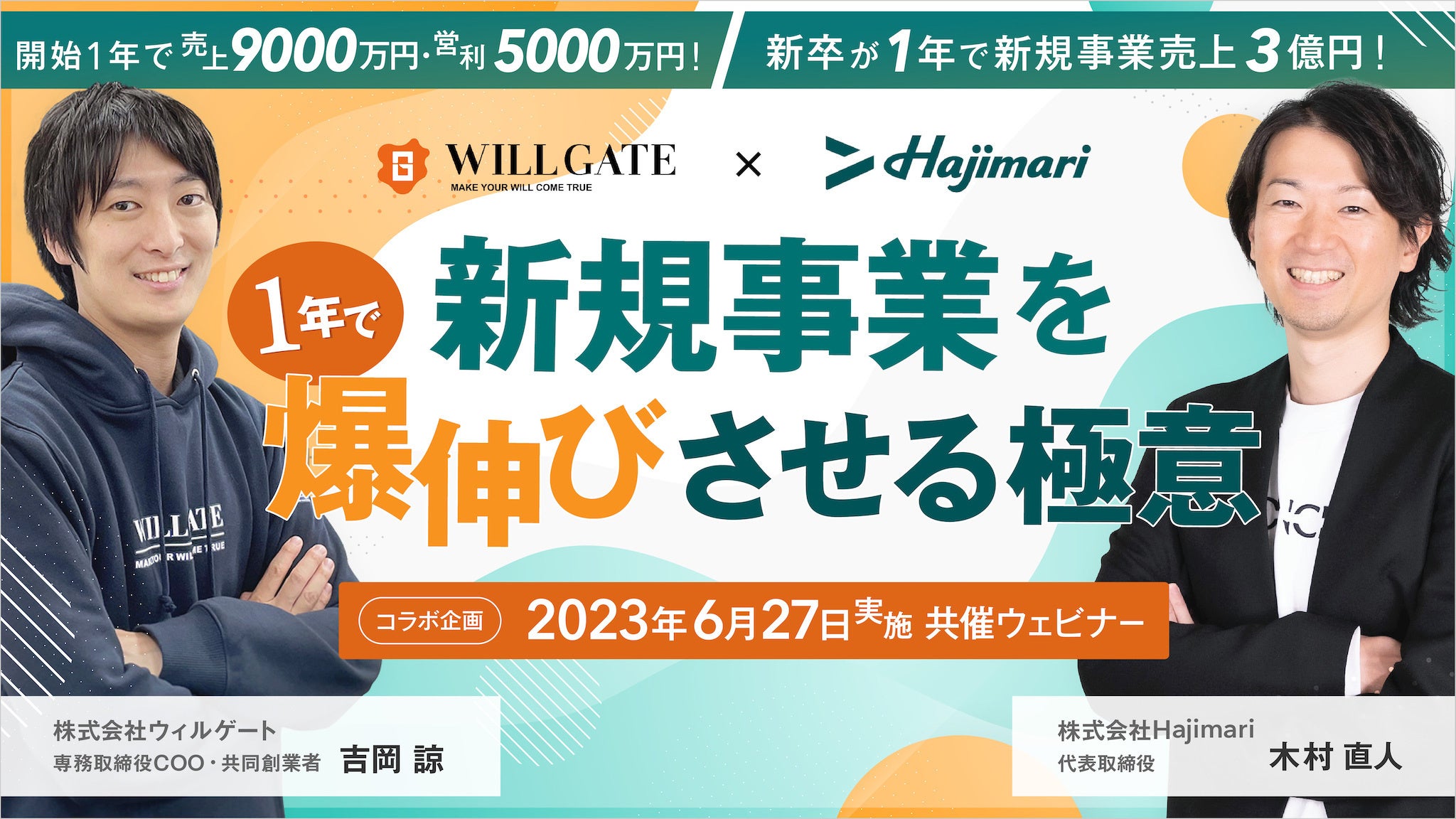 本セミナーでは、企業経営者・事業責任者・事業企画・Bizdev.・PdMの方々向けに、正社員2名で初年度売上1000万を突破させた株式会社ウィルゲートCOO吉岡諒と新規事業を1年で売上3億円まで急成長させた株式会社Hajimari代表木村直人氏より、1年で新規事業を爆伸びさせる秘訣をお伝えさせていただきます。
