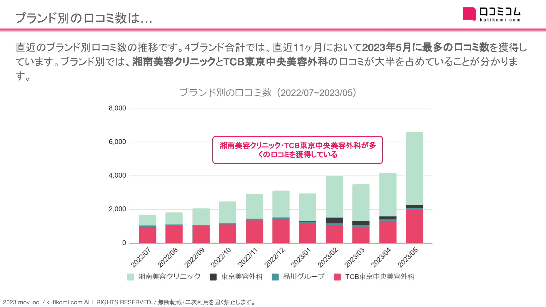 直近のブランド別口コミ数の推移です。4ブランド合計では、直近11ヶ月において2023年5月に最多の口コミ数を獲得しています。ブランド別では、湘南美容クリニックとTCB東京中央美容外科の口コミが大半を占めていることが分かります。