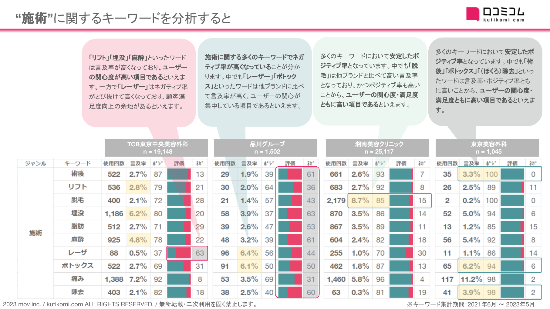 品川グループでは、施術に関する多くのキーワードでネガティブ率が高くなっていることが分かります。中でも「レーザー」「ボトックス」といったワードは他ブランドに比べて言及率が高く、ユーザーの関心が集中している項目であるといえます。