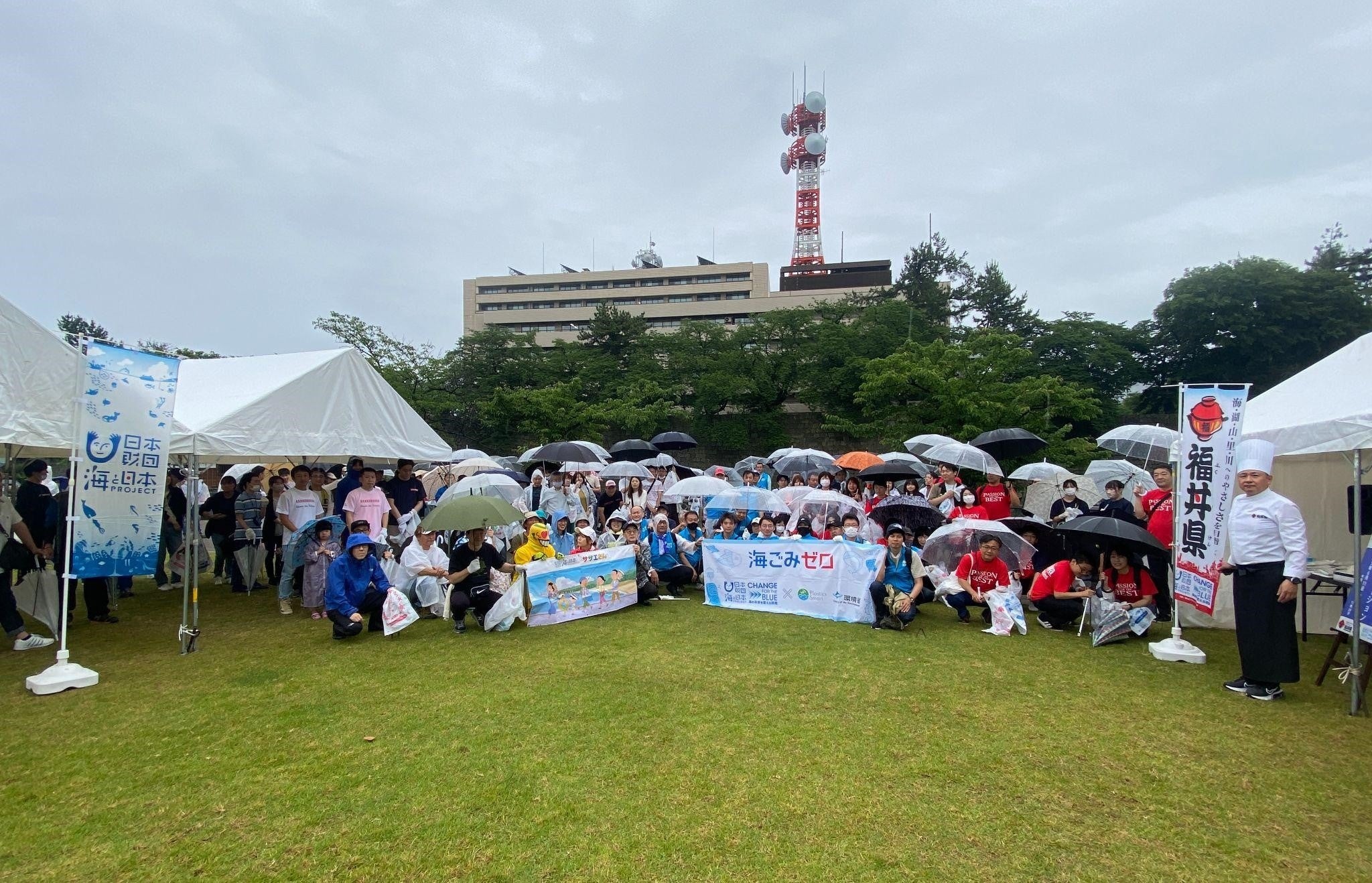 福井駅前にオフィスがある企業や団体、告知をみた家族連れなど多くの方が本イベントに参加し、天気はあいにくの雨でしたが、開始式では写真におさまりきらないほどの人となりました。