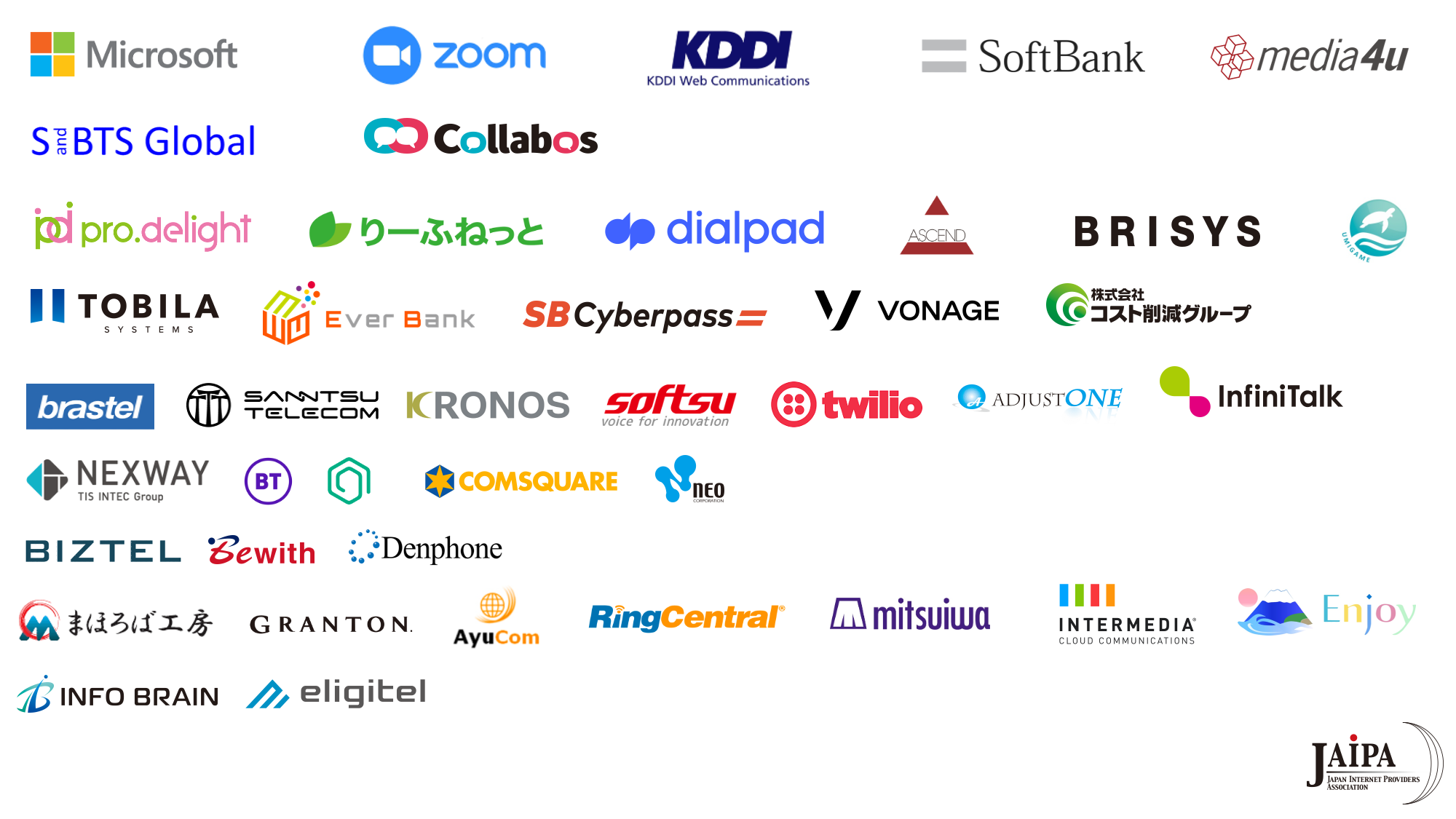 会 員: ⽇本マイクロソフト株式会社・ZVC Japan株式会社(zoom)・株式会社KDDIウェブコミュニケーションズ・ソフトバンク株式会社・株式会社まほろば⼯房・株式会社りーふねっと・株式会社Eligitel・株式会社プロディライト・株式会社三通テレコムサービス・インフォブレイン株式会社・インターメディア・テクノロジーズ・ジャパン合同会社・有限会社アユコム・株式会社アセンド・株式会社メディア4u・デンフォン株式会社・株式会社クロノス・ブライシス株式会社・株式会社Enjoy・ブラステル株式会社・株式会社ウミガメ・株式会社グラントン・株式会社リンク・株式会社ソフツー・ミツイワ株式会社・Twilio Japan合同会社・Dialpad Japan株式会社・株式会社アジャストワン・ジェイエムエス・ユナイテッド株式会社・リングセントラルジャパン株式会社・株式会社ネクスウェイ・ビーウィズ株式会社・S and BTS Global株式会社・BTジャパン株式会社・Cloopen株式会社・トビラシステムズ株式会社・株式会社エバーバンク・株式会社コムスクエア・エスビーサイバーパス株式会社・株式会社コラボス・株式会社NEOコーポレーション・Vonage Japan 合同会社・株式会社コスト削減グループ(2023年6⽉10⽇)