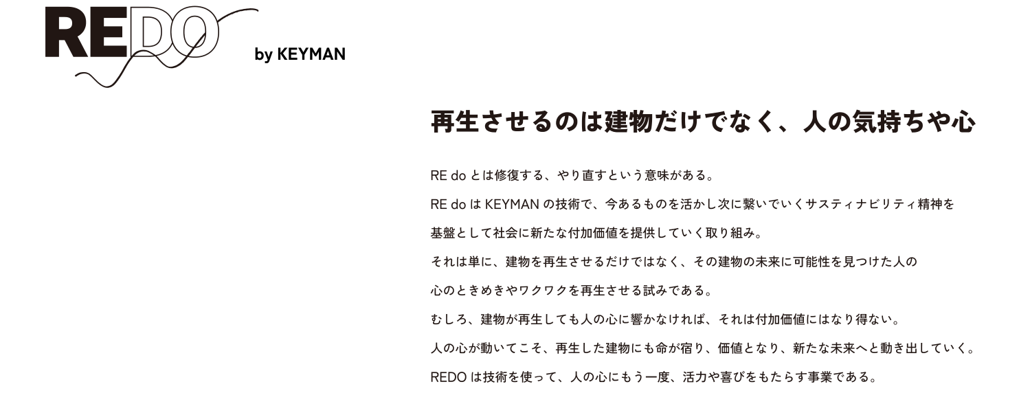創業30年を迎える弊社は、「構造物の耐震化・長寿命化」をテーマに土木と建築の両分野で、耐震補強技術を研鑽し、老朽化建造物のメンテナンスに特化した事業を展開しています。最近では省エネルギーや脱炭素など新たな取り組みが建設業界でも始まっている中、「古い建物から新たな価値を創出」をビジョンに掲げ、RE・do(リド)新規事業を立ち上げました。