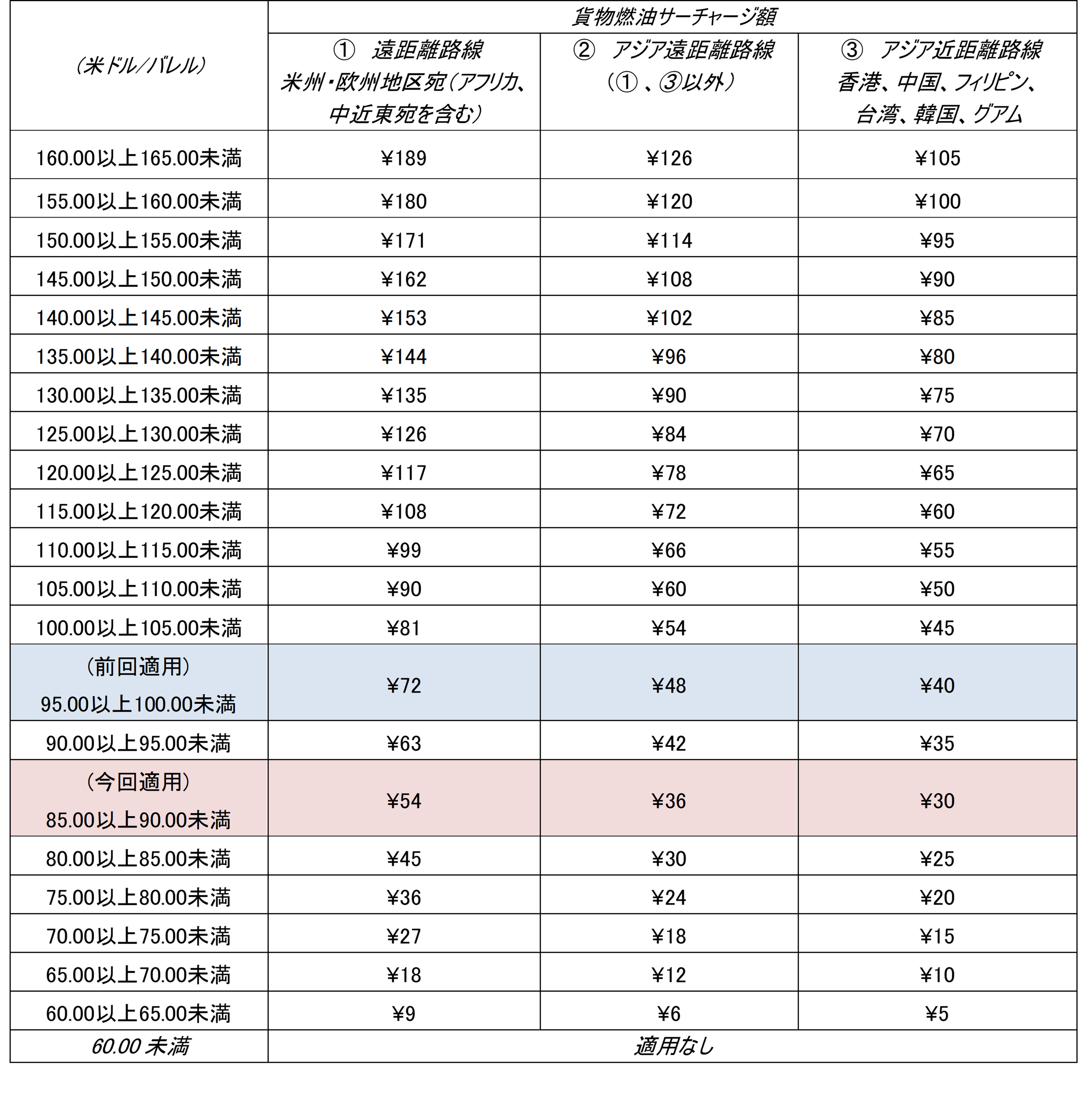 貨物燃油サーチャージテーブル (表示価格は貨物1kgあたり)