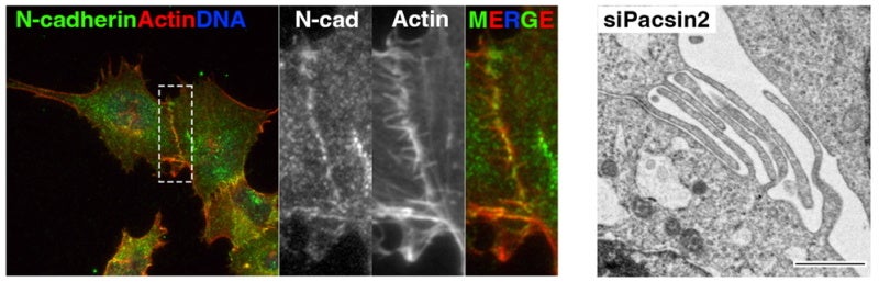 図3.Pacsin 2 RNAiによって誘導される細胞同士の接着。細胞接着部位のN-カドヘリン(緑)、アクチン(赤)、DNA(青)の蛍光顕微鏡像(左)と、電子顕微鏡像(右)を示す