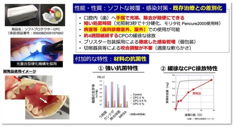 国立大学法人岡山大学(本部:岡山市北区、学長:那須保友)の学術研究院医歯薬学域(歯)歯周病態学分野の大森一弘准教授と高柴正悟教授、岡山大学病院新医療研究開発センターの伊東孝助教、岡山大学学術研究院医歯薬学域生体材料学分野の入江正郎博士研究員、サンメディカル株式会社、株式会社モリタの研究グループは、国立研究開発法人日本医療研究開発機構(AMED)の橋渡し研究戦略的推進プログラム(シーズB)の支援を受け、がん化学療法時に多発する口腔粘膜炎の痛みを和らげる効果が期待される新規口腔粘膜保護材(商品名:ソフトプロテクターCPC)を開発し、2023年5月23日に医療機器(クラスII)の承認を取得しました。
