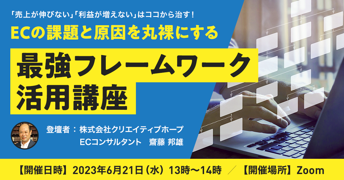 20230621開催「ECの課題と原因を丸裸にする 最強フレームワーク活用講座」は、ECの売上が伸びない・利益が増えない等の課題と原因を丸裸にするノウハウを伝授するオンラインセミナーです。本ウェビナーを通じて、適切な判断が求められるEC関係者の必須スキルをマスターしましょう!