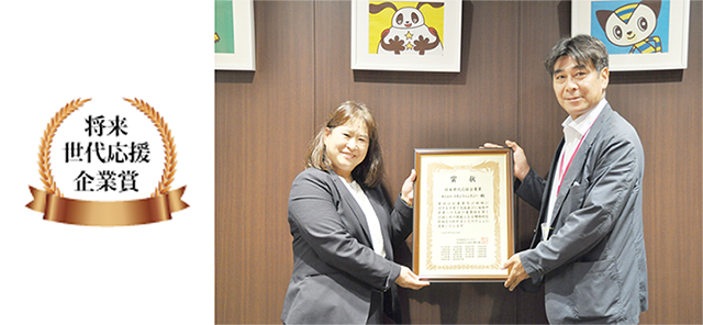 この度、当社の育児休職取得率(育児目的休暇を含む)が男女ともに100%を達成した(2022年度)ほか、各種育児制度を整備するなど、子育て支援ならびに女性や若者への支援に対し、独自性、先進性のある取組を積極的に行っている点が評価され、「将来世代応援企業賞」の受賞に至りました。
