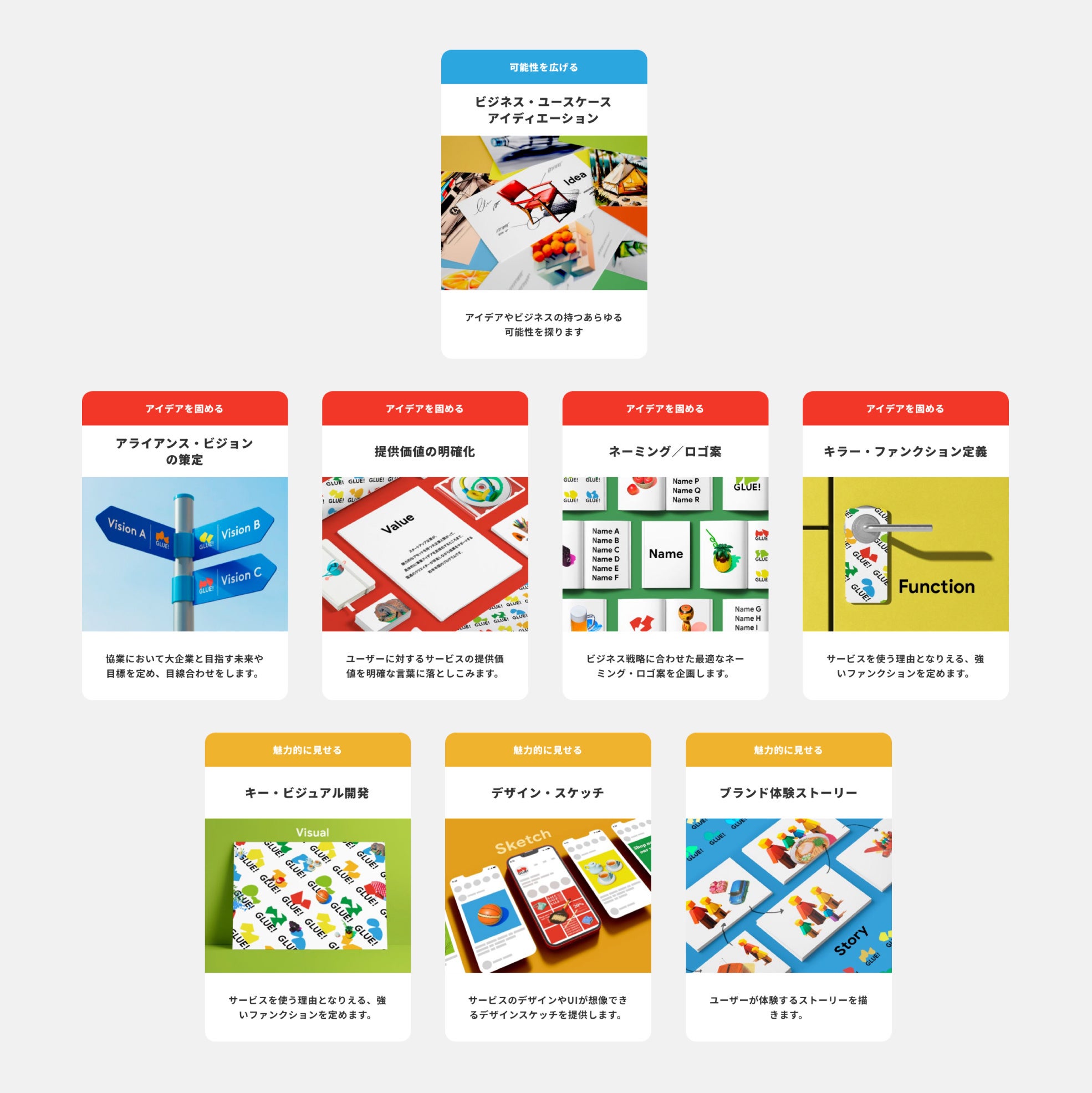 大企業とマッチングし、アライアンス・フェーズに進んだスタートアップ企業は(1)ビジネス・ユースケースアイディエ―ションで可能性を拡げる(2)アライアンス・ビジョンの策定やキラー・ファンクションの定義でアイデアを固める(3)キー・ビジュアルの開発やブランド体験ストーリーの設計で魅力的に見せる、3ステップのクリエイティブ支援を受けることができます。