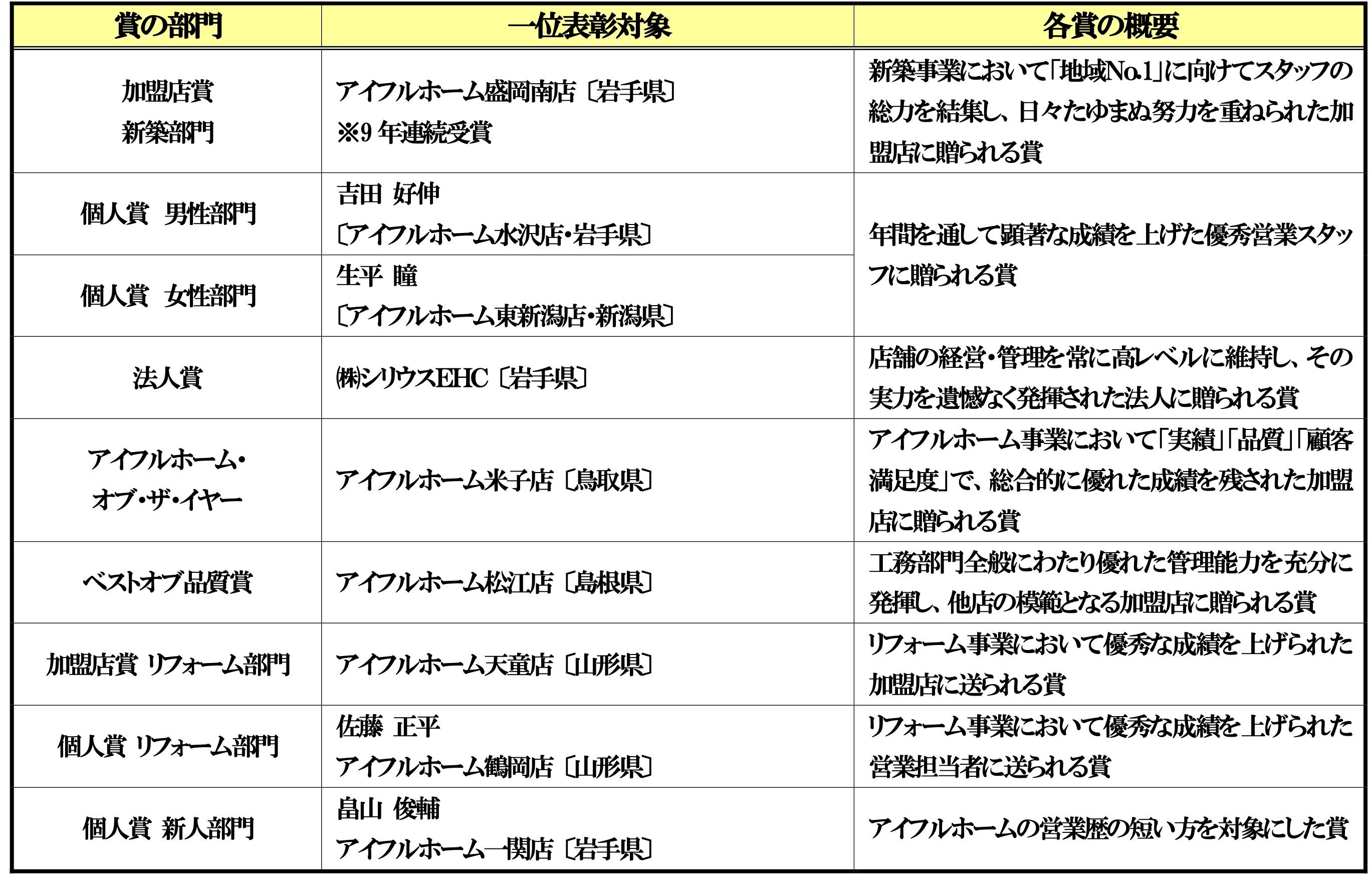 ベストオブ品質賞はアイフルホーム松江店が、アイフルホーム・オブ・ザ・イヤーはアイフルホーム米子店が受賞。加盟店賞 新築部門は、アイフルホーム盛岡南店が9連覇を達成しました。なお、2022年度の各種コンテストの受賞者・受賞店は次頁の通りです。
