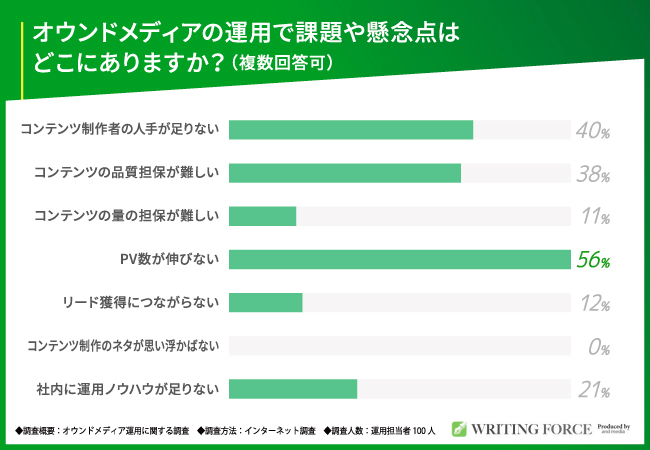そこで最後に、「オウンドメディアの運用で課題や懸念点はどこにありますか?(複数回答可)」と質問したところ、「PV数の伸び悩み」や「コンテンツ制作者の人手不足」といった、オウンドメディア運用の成果に直結するような悩みを持つ企業がとても多いことが分かりました。