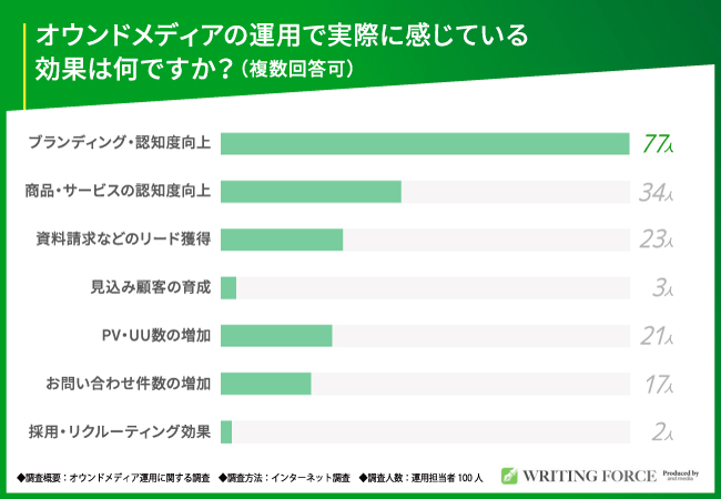 「オウンドメディアの運用で実際に感じている効果は何ですか?(複数回答可)」と質問したところ、オウンドメディアは、企業や商品・サービスのブランディングや認知度向上、リード獲得といった目的で運営されていることが分かりました。