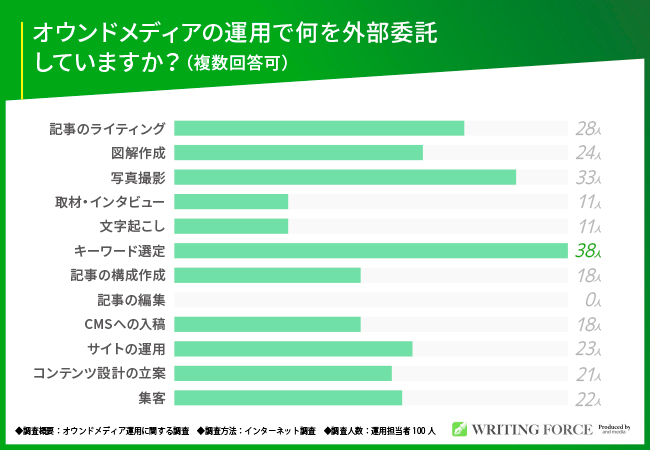 また、記事のライティングや図解作成など、コンテンツ制作周辺の業務も委託される企業が多いことが分かります。