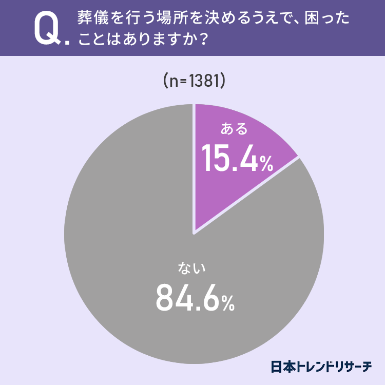 葬儀を行う場所を決めるうえで、困ったことが「ある」と回答したのは15.4%でした。