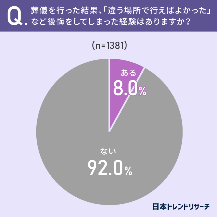 8%の方が、葬儀を行った結果「違う場所で行えばよかった」など後悔をしてしまった、と回答しています。