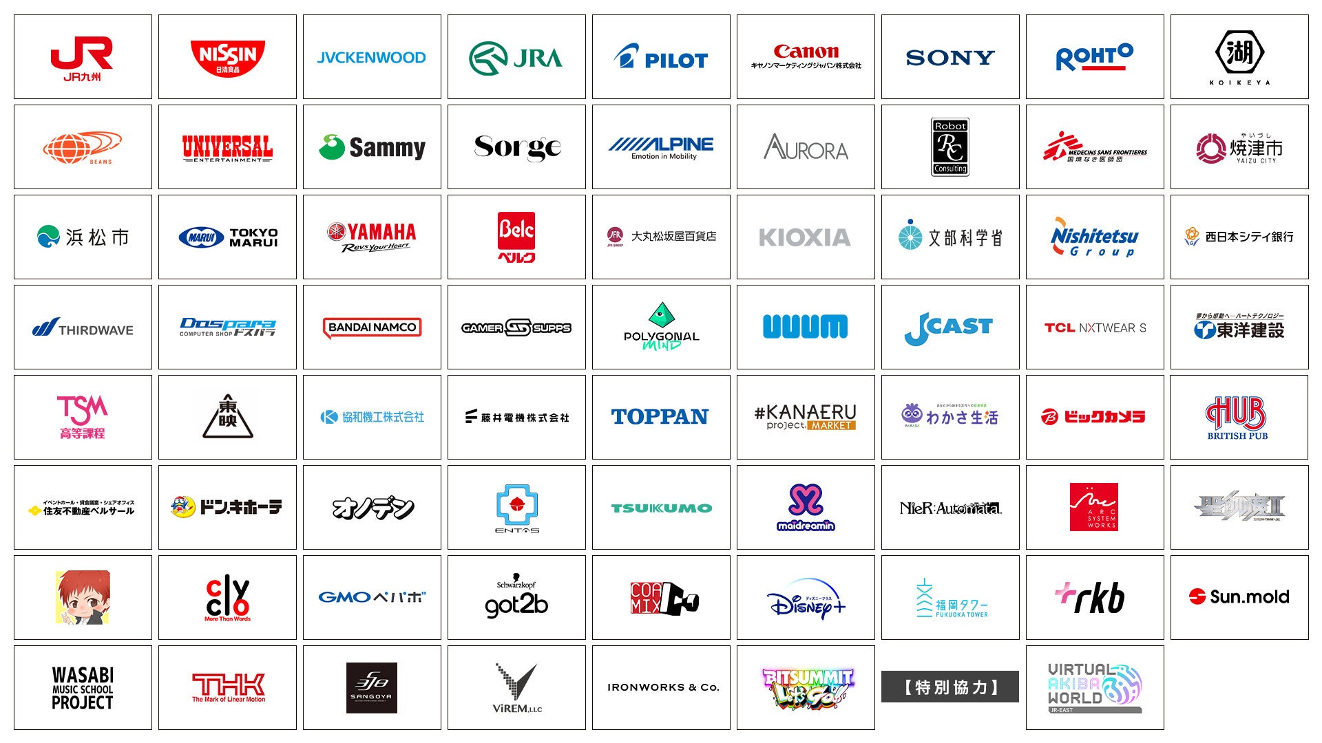 九州旅客鉄道株式会社/日清食品株式会社/株式会社JVCケンウッド/日本中央競馬会(JRA)/株式会社パイロットコーポレーション/キヤノンマーケティングジャパン株式会社/ソニー株式会社/ロート製薬株式会社/株式会社湖池屋/株式会社ビームス/株式会社ユニバーサルエンターテインメント/サミー株式会社/Sorge/アルパインマーケティング株式会社/オーロラ株式会社/株式会社Robot Consulting/特定非営利活動法人 国境なき医師団日本/静岡県焼津市/静岡県浜松市/株式会社東京マルイ/ヤマハ発動機株式会社/株式会社ベルク/株式会社大丸松坂屋百貨店/キオクシア株式会社/文部科学省/西日本鉄道株式会社/株式会社西日本シティ銀行/株式会社サードウェーブ/ドスパラ/バンダイナムコミュージックライブ/ゲーマーサップス(Gamer Supps®)/ポリゴナルマインド/UUUM/株式会社ジェイ・キャスト/TCL RayNeo/東洋建設株式会社/SO.ON project LaV 東京スクールオブミュージック&ダンス専門学校/東映株式会社/協和機工株式会社/藤井電機株式会社/凸版印刷株式会社/かなプロマーケット/株式会社わかさ生活/株式会社ビックカメラ/株式会社ハブ/住友不動産ベルサール株式会社/株式会社パン・パシフィック・インターナショナルホールディングス/株式会社オノデン/秋葉原エンタス/TSUKUMO/めいどりーみん/NieR:Automata/アークシステムワークス株式会社/聖飢魔Ⅱ/赤髮のとも/合同会社クリクロ/GMOペパボ株式会社/Schwarzkopf got2b/コアミックス//ディズニープラス/福岡タワー/RKB毎日放送株式会社/日本サンモルド株式会社/山葵音楽学校プロジェクト/THK株式会社/株式会社三五屋/合同会社ViREM/有限会社アイアンワークス/BitSummit