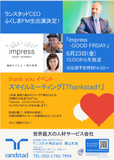 この度のサンキューイベントはランスタッドの郡山支店が中心となり企画いたしました。これまでは派遣先の職場単位での開催が通常でしたが、ランスタッドからスタッフを派遣させていただいているエフエム福島様の協力を得て一部ラジオを通じたイベントとすることで、初めて県内の全スタッフを対象に開催することとなりました。ポール・デュプイはラジオを通じて波乱万丈な自身のヒューマンストーリーを披露しながら福島の派遣スタッフにエールを送るとともに、福島で働くすべての皆さまと絆を深める予定です。