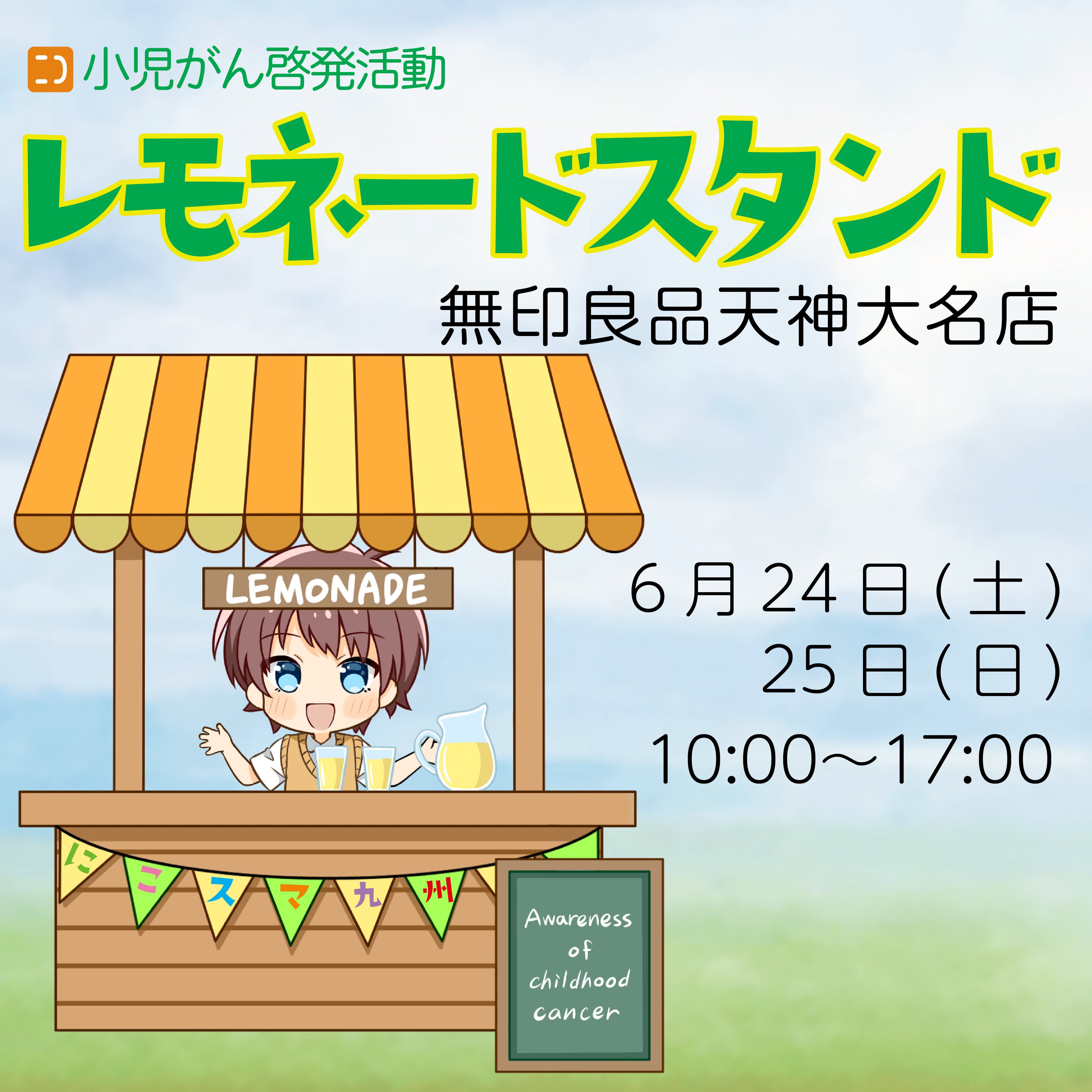 レモネードスタンドはアメリカに住む小児がんの女の子が治療開発の研究資金を集めるために庭先でレモネードを売ったことが始まりです。現在この活動は世界へ広がり、福岡でも2009年から天神パサージュ広場等で開催しています。