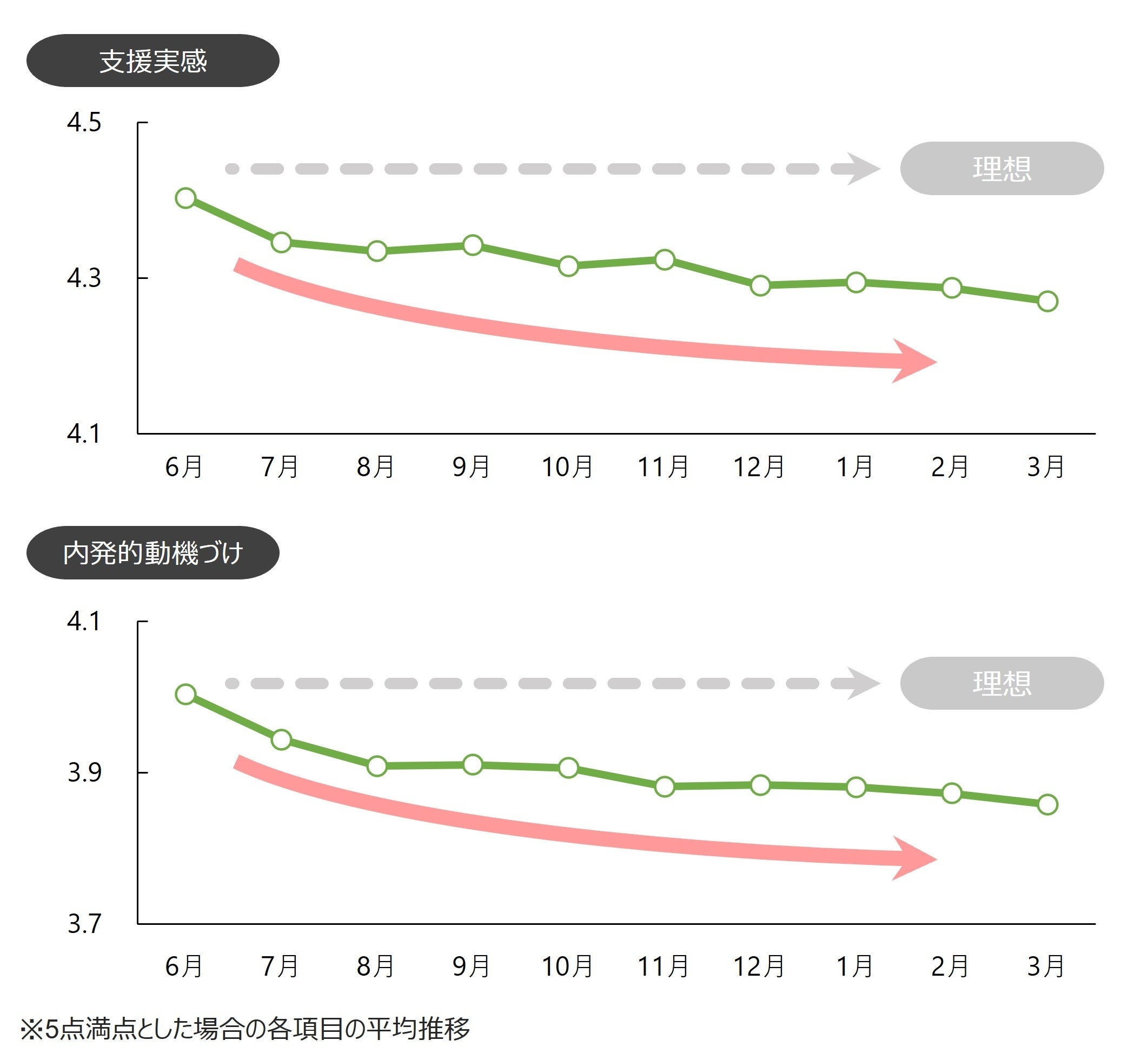 支援実感と内発的動機づけは、配属直後をピークに下がり続ける