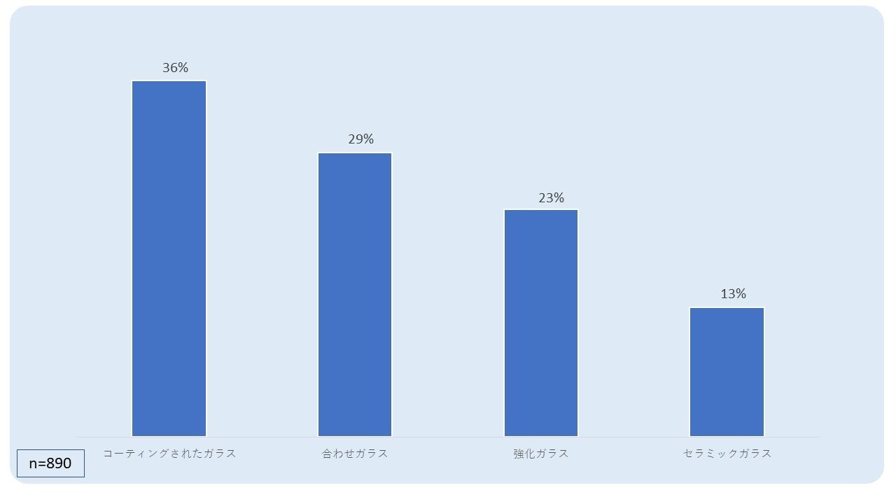 - 製品タイプ別では、「コーティングガラス」(35.7%)が第1位となり、「合わせガラス」(28.5%)、「強化ガラス」(22.8%)も多く選ばれています。