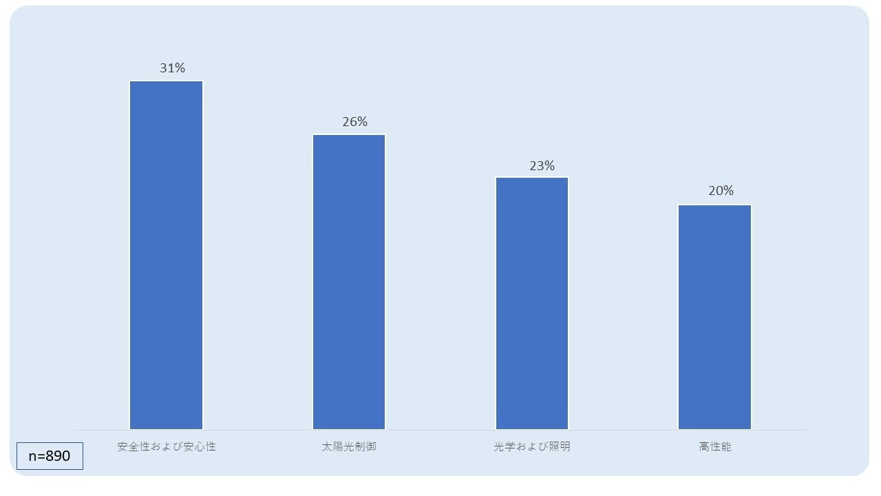 - ほとんどの参加者が、「安全性と安心性」(31.1%)と回答し、次いで「太陽光制御」(26.3%)、「光学と照明」(22.5%)、「高機能」(20.1%)と続きました。