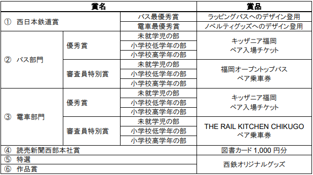 ①~③を受賞の方には、「西鉄バスor西鉄電車のグッズ詰合せ」もプレゼントいたします。