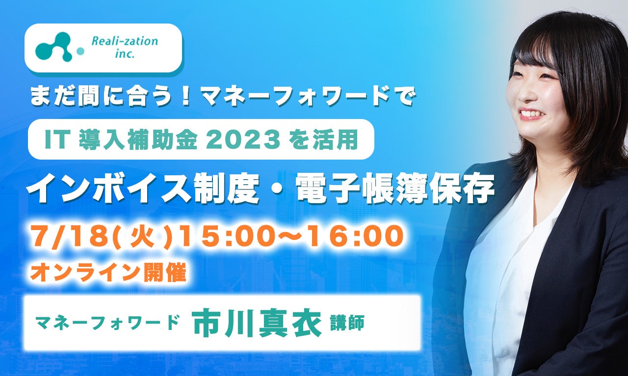 これまでに1,000件以上、総額40億円以上の補助金申請を行ってきた株式会社リアリゼイション(住所:東京都渋谷区渋谷3-6-2エクラート渋谷ビル4F 代表取締役:森垣洋平)は、「まだ間に合う!IT導入補助金を活用したインボイス制度や電子帳簿保存法に関する無料セミナー​」と題し、株式会社マネーフォワードの「市川 真衣」様をお招きし、無料セミナーを開催いたします。