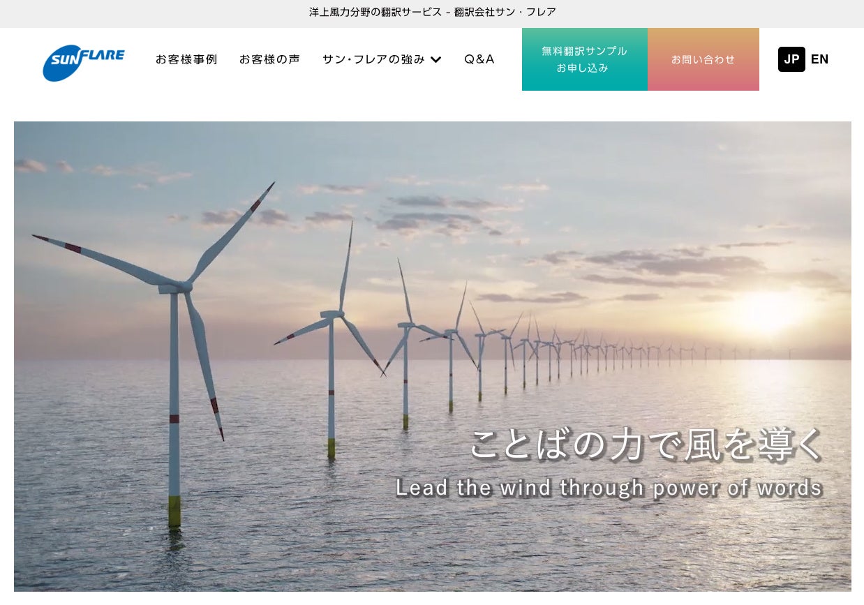 今回リニューアルされた情報サイトでは、洋上風力発電分野向けの翻訳サービスについて、サン・フレアの強みや対応ドキュメント、翻訳実績・事例を分かりやすくご紹介しています。また、期間限定(~2023年6月30日)で洋上風力関連文書の無料翻訳サンプルもご提供しております。期限が迫っておりますので、ご入用の方はぜひこの機会にお申し込みくださいませ。