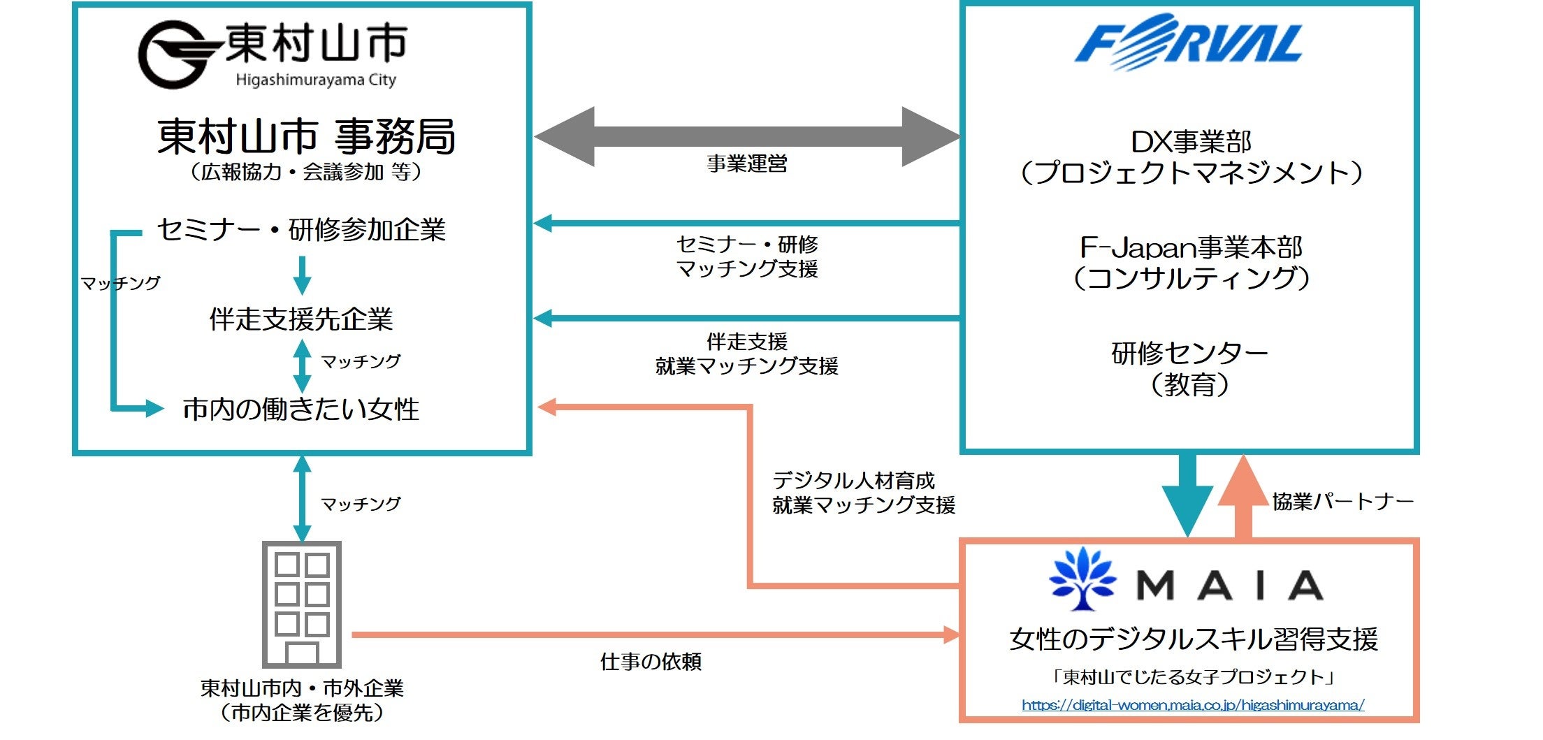 今回の業務委託では、東村山市内の中小企業が抱える経営課題を解決するために、伴走型経営コンサルティング(次世代経営コンサルティング)を提供し、DX推進をサポートいたします。さらに、東村山市在住の女性に対し、ITスキルなど市場価値の高いデジタル教育を提供し、同一委託内で支援する市内中小企業を優先とした就業・就労支援に取り組むことで、収入向上と市内雇用創出・多様な働き方を推進しているまちとしての価値の向上を図ります。