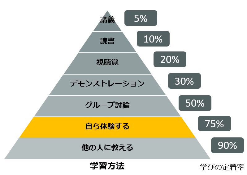 アメリカ国立訓練研究所が発表した、学習方法と知識の定着率に関する研究によると、自ら体験することは75%の定着率があると記されております。
