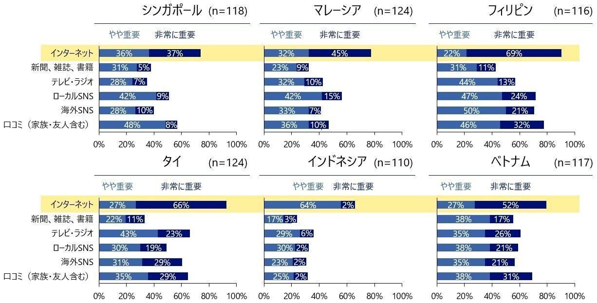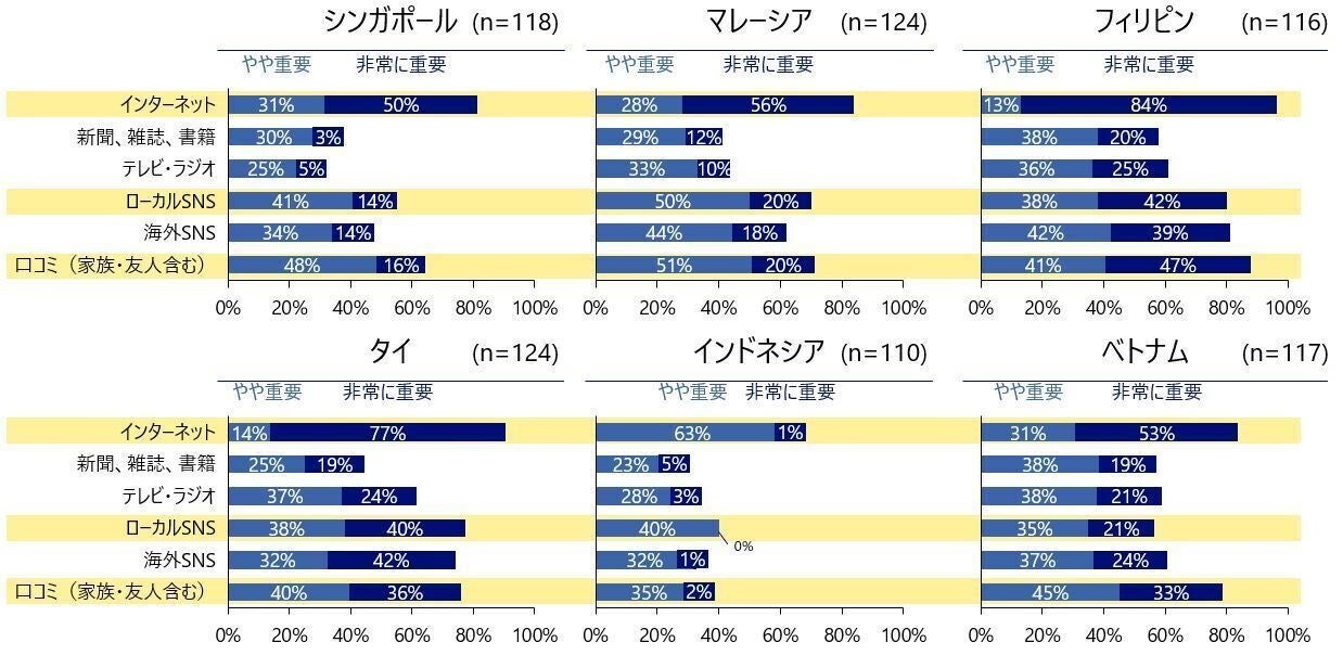 ■情報源として最も重視されているのは各国共通でインターネット。その他、国別に口コミやローカルSNS、テレビ・ラジオ等についても重視されている。