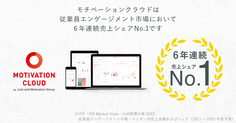 この度、従業員エンゲージメント市場のベンダー別売上金額およびシェア6年連続で第1位(2017~2022年度予測)を獲得した「モチベーションクラウド」は、延べ10,340社329万人以上という国内最大級のデータベースをもとに組織状態を診断し、従業員エンゲージメント向上を支援するクラウドサービスです。