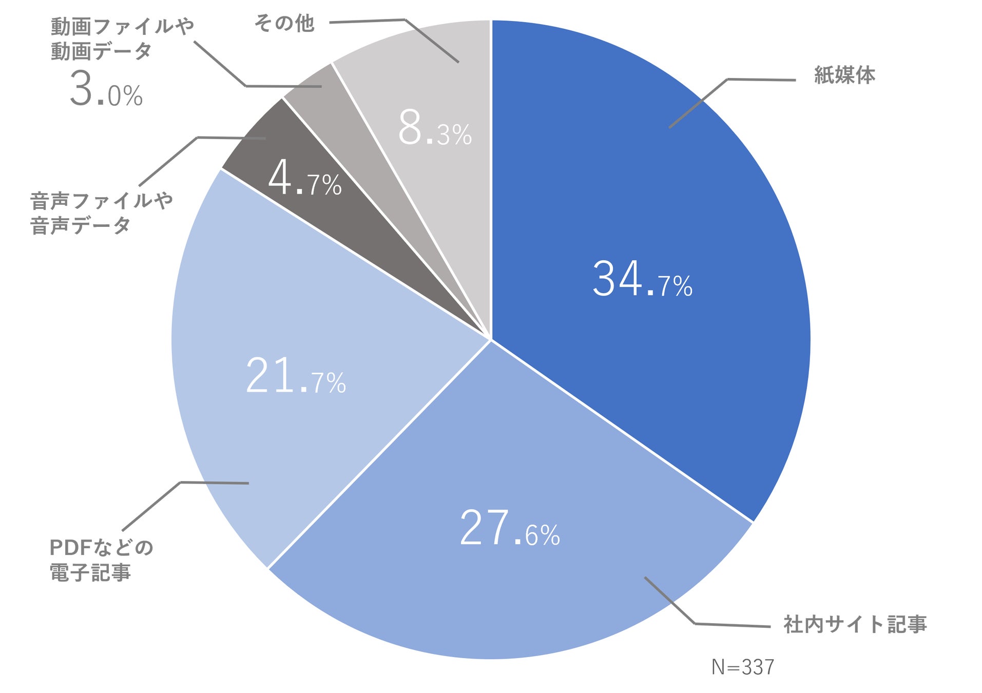 紙媒体、PDFなどの電子記事、Webサイト記事などの読み手側に「読む」というアクションが必要になる媒体が80%以上。その中でも紙媒体が34.7%と全体の3割を超える割合を占めている。