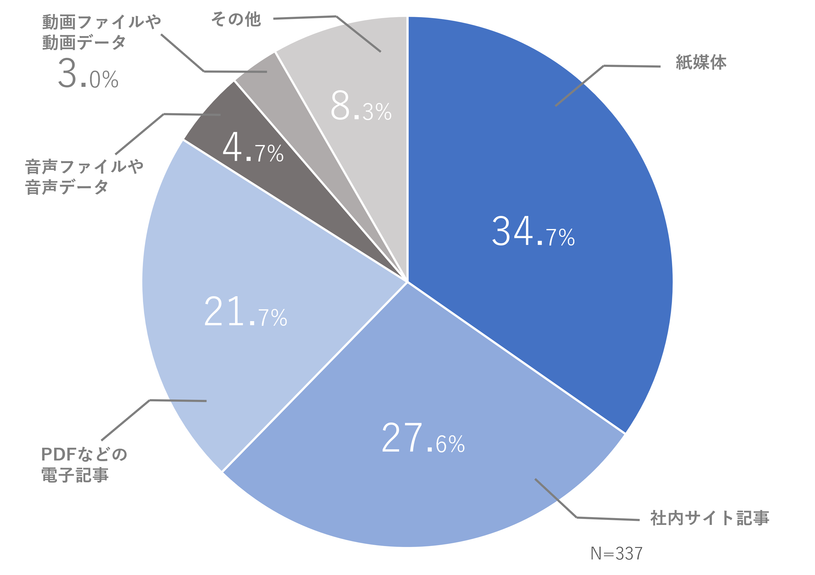 紙媒体、PDFなどの電子記事、Webサイト記事などの読み手側に「読む」というアクションが必要になる媒体が80%以上。その中でも紙媒体が34.7%と全体の3割を超える割合を占めている。